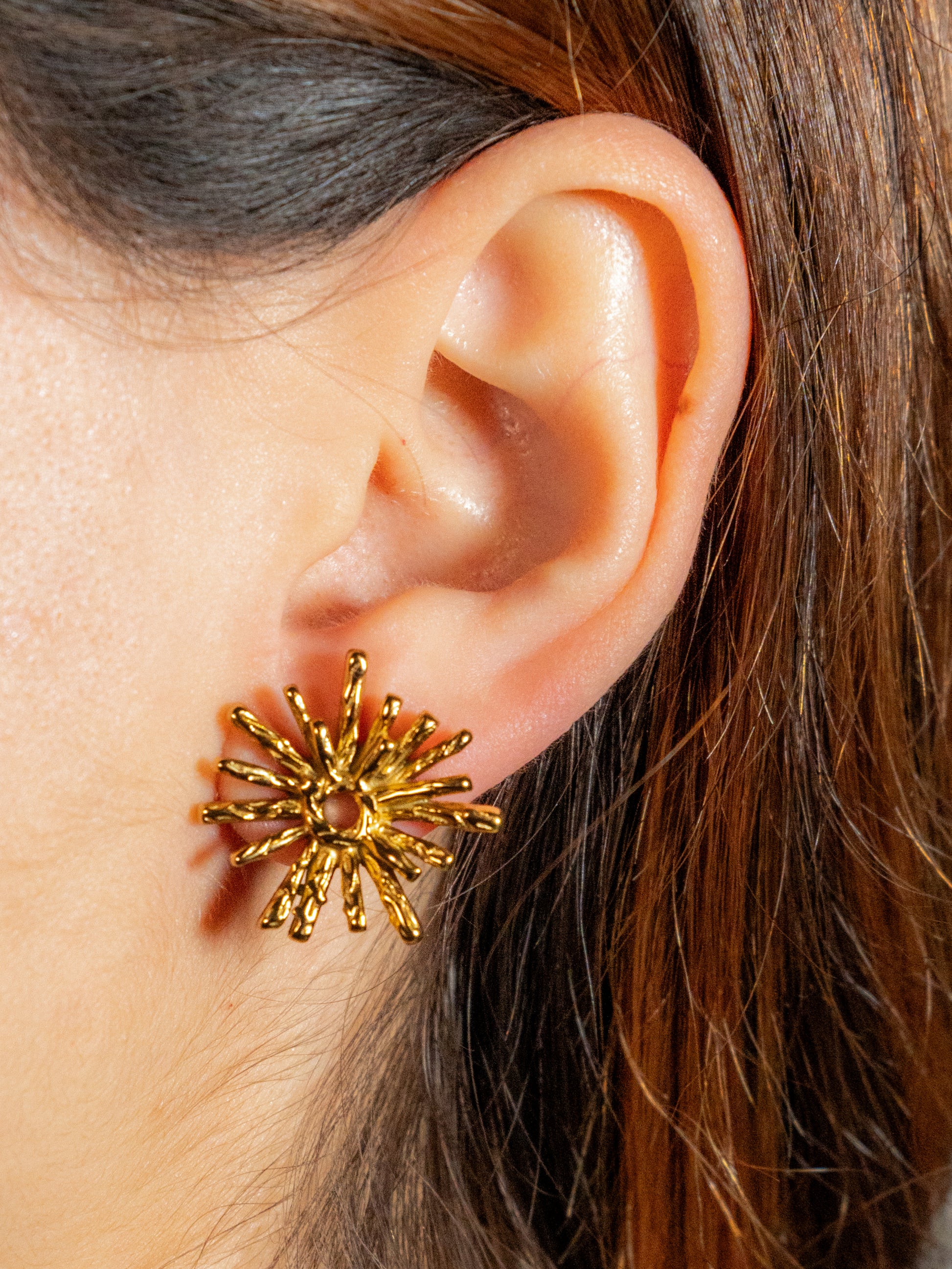 Les boucles d’oreilles Suaren sont une création délicate et pleine de caractère. Leur design doré en acier inoxydable évoque l’éclat d’un feu d’artifice, avec des lignes fines et rayonnantes qui captent la lumière à chaque mouvement.