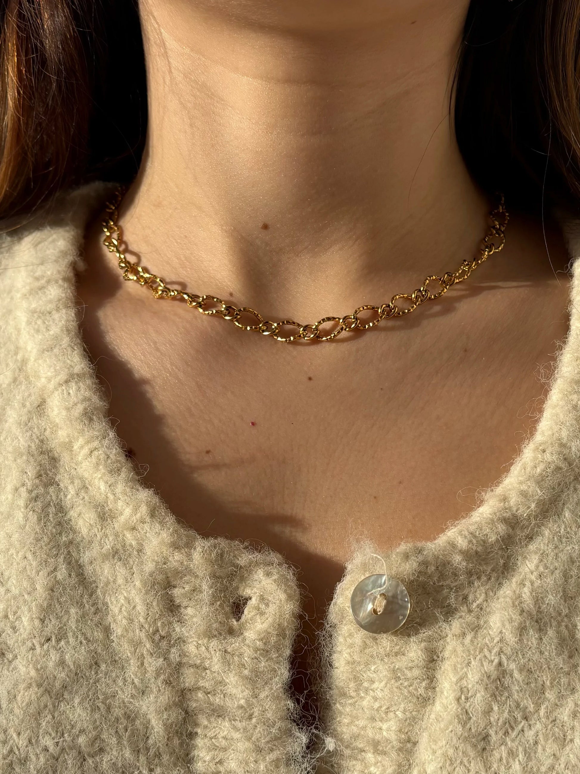 Adoptez un style unique avec ce collier doré texturé à personnaliser. Sa chaîne dorée texturée en acier inoxydable mesure 37 cm, avec une extension de 5 cm pour un ajustement parfait à votre cou.